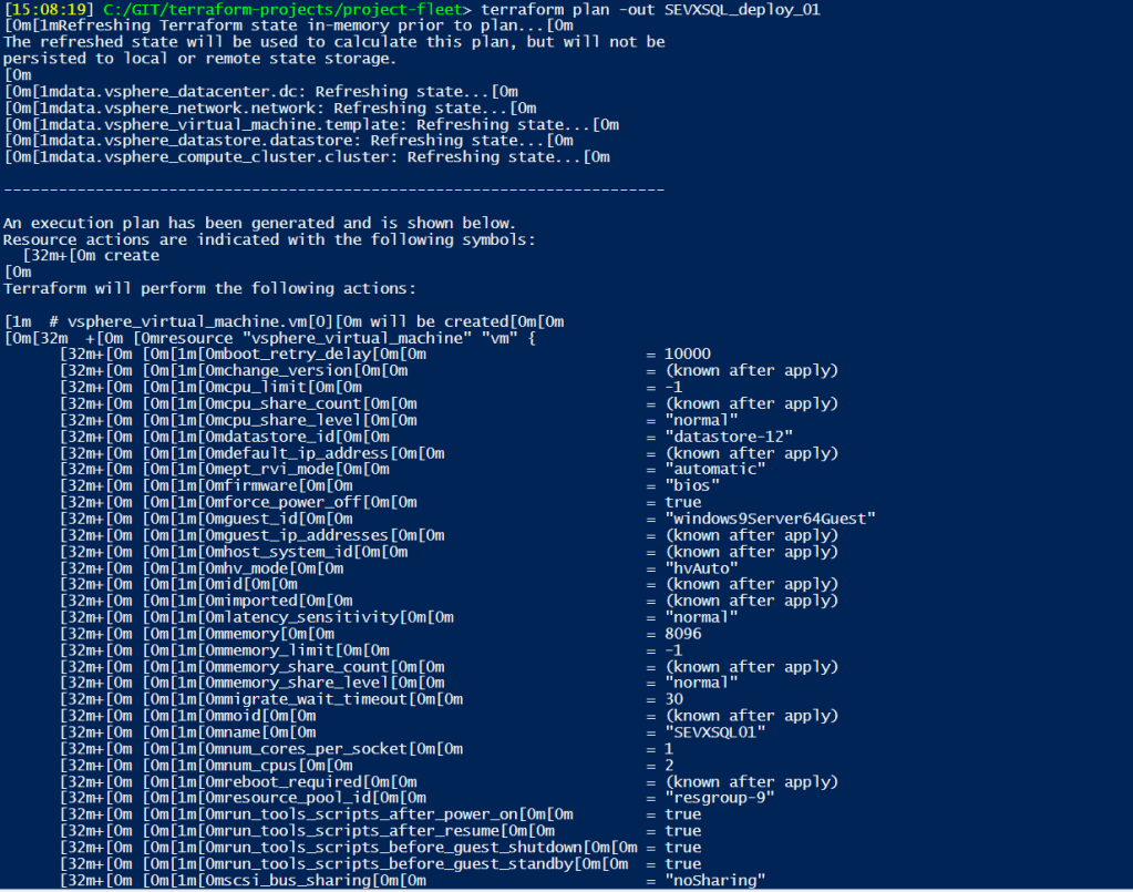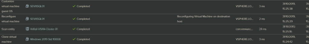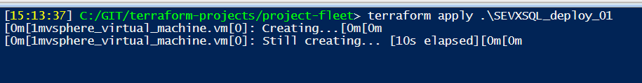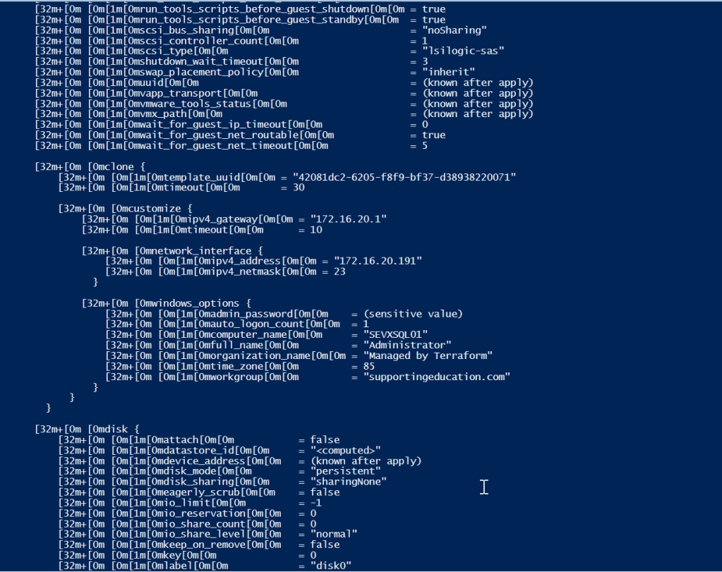 Sometimes the creation goes forever, and customisation fails…that happened with sysprep-ed template, and some say it is due to the fact that Terraform does it’s own sysprep and does not expect the template to be sysprep-ed.